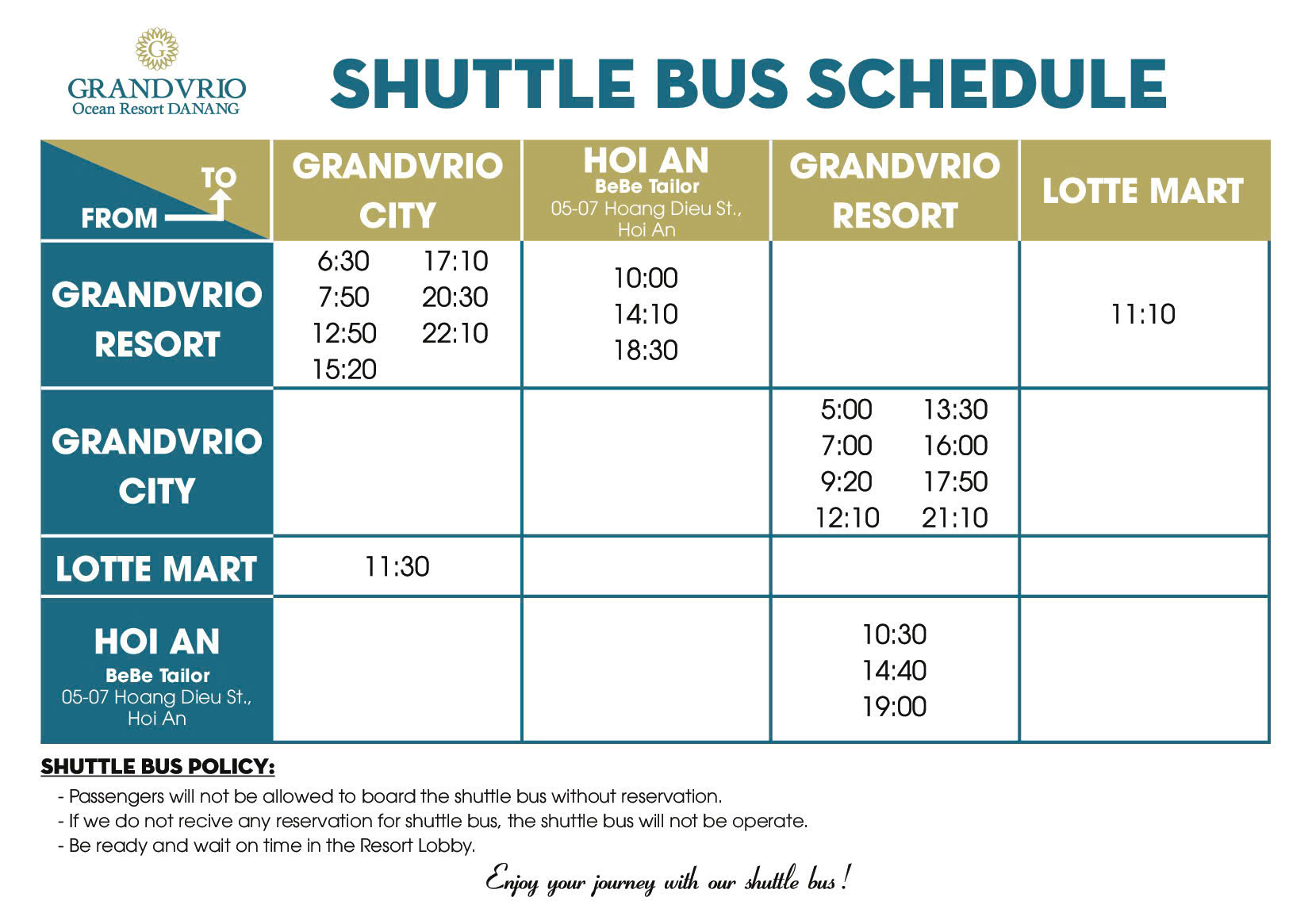 Qグラン ヴィリオ オーシャン リゾート ダナンにはダナン市内・ホイアンへの無料シャトルバスのサービスはありますか?もし、あればスケジュールを教えてくださいA